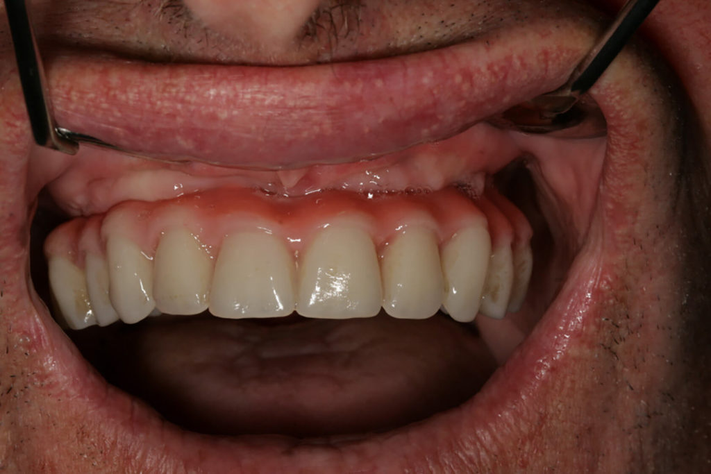 The patient has lost quite a lot of vertical height of bone – but not evenly – so I decided to go with the nice and simple hybrid. I have just added his PAs from Monday’s review and integration check. These are from two months after implant placement and loading.