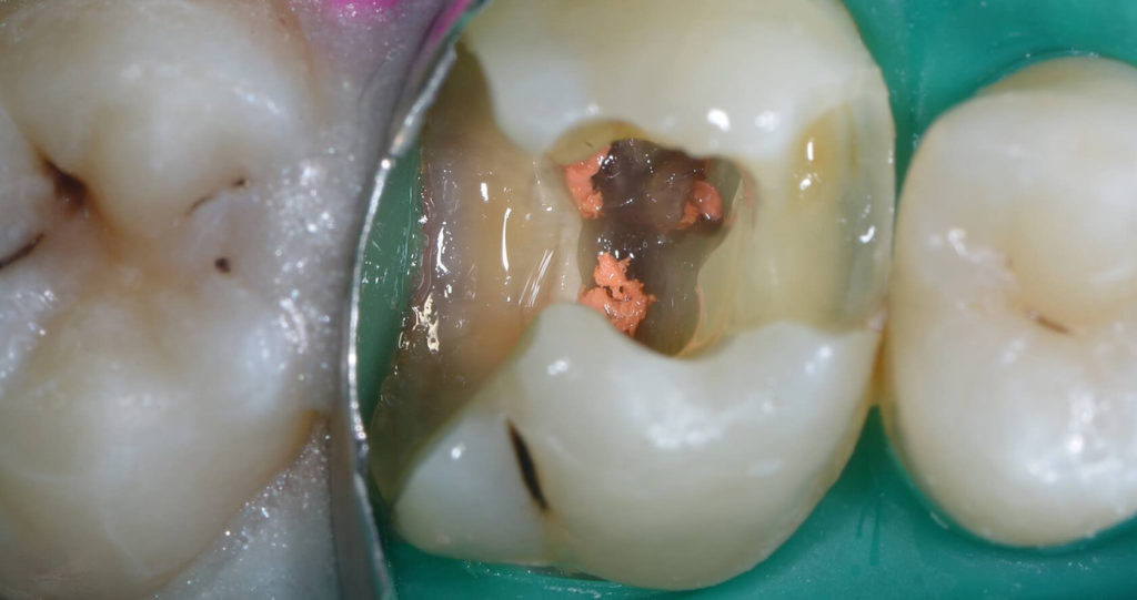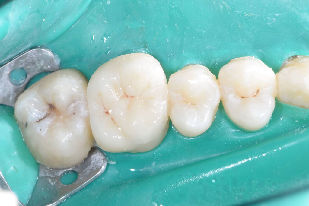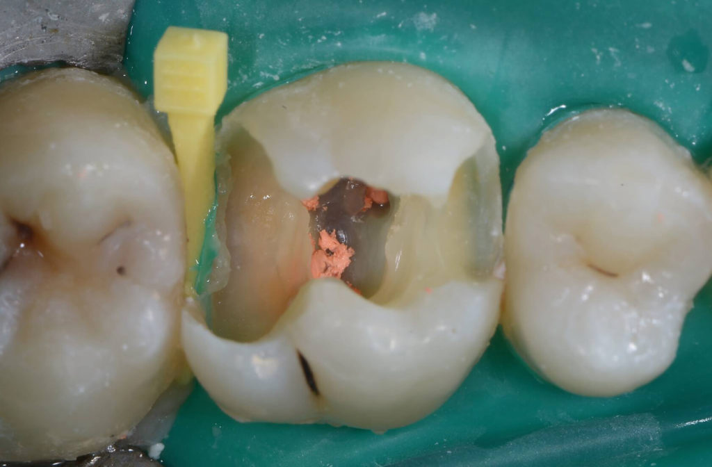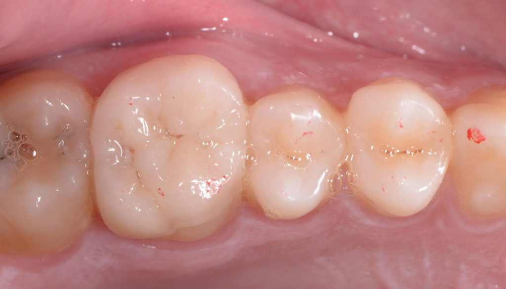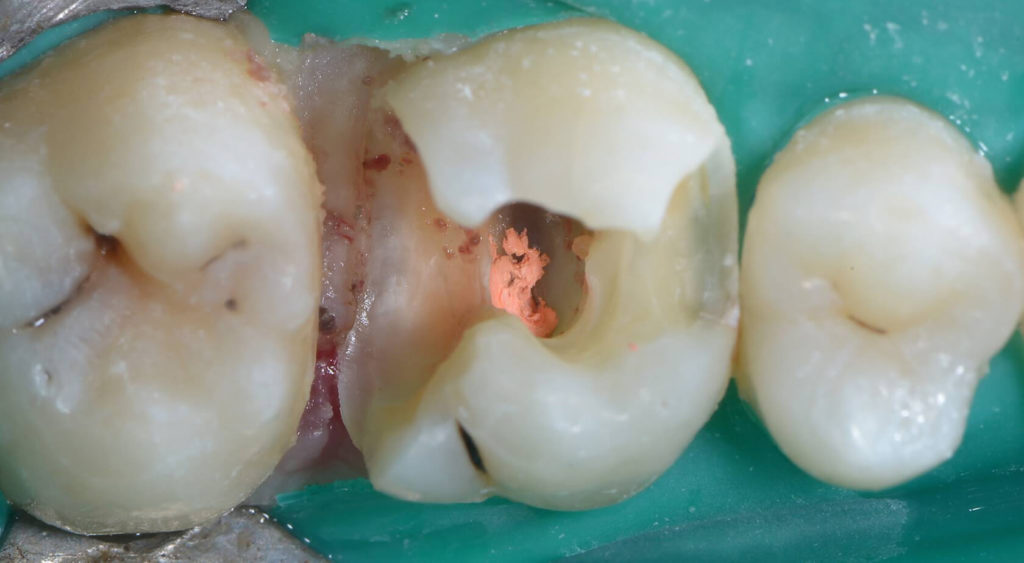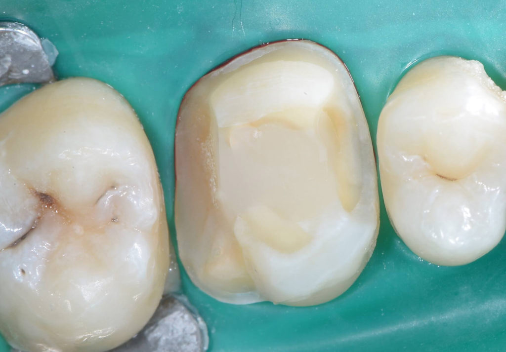 Patient presented with deep distal decay on first molar. Used deep margin elevation and papillectomy. No attempt was made to establish 3 mm biologic width space. Overlay prep and lithium disilicate indirect restoration placed. Photos from 15 month follow up included.